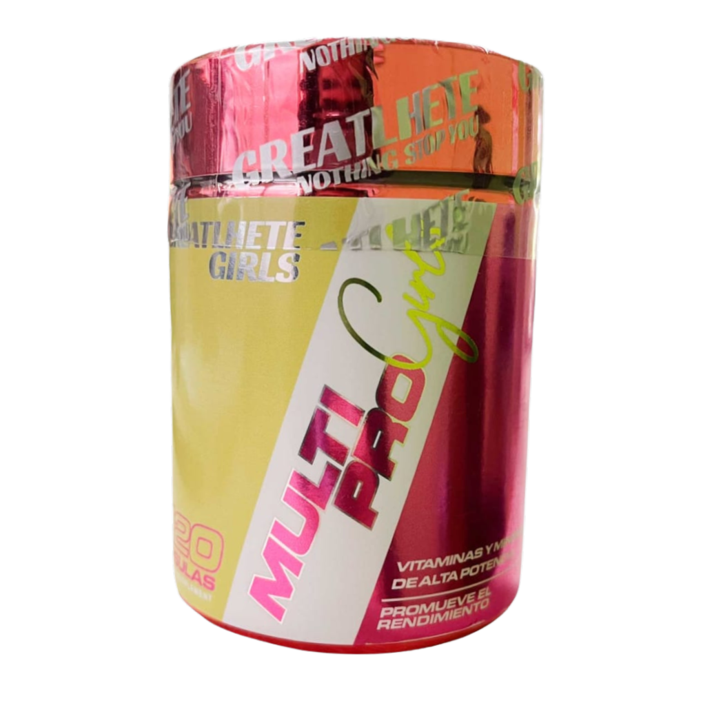 El Multivitamínico Multi Pro Girls de Greatlhete se presenta como un suplemento alimenticio y deportivo con adición de vitaminas y minerales de alta potencia, promoviendo un sistema inmunológico fuerte y un aumento del rendimiento, especialmente diseñado para mujeres.