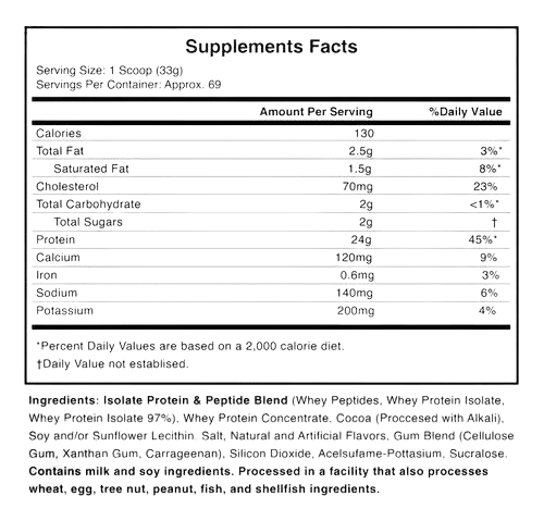 Cada porción aporta 24 gr de proteína ultra-premium suministrando 5,5 gr de BCAA y 4 gr de glutamina.