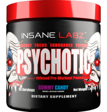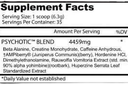 PSYCHOTIC INSANE LABZ es uno de los pre-entrenos en polvo más poderosos del mercado. Con la adición del ingrediente registrado Ampiberry el cual prolonga la vida del estimulante en los ingredientes por hasta 3 horas. Psychotic está hecho para atletas de élite y no debe ser usado por principiantes.